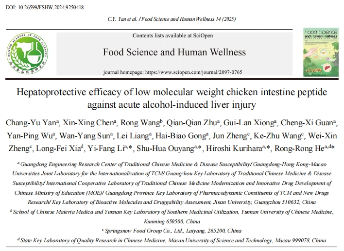 食物来源的生物活性肽具有良好的健康促进作用。本研究通过胰酶水解和超滤制备了低分子量鸡肠肽(CIP,分子量低于2 kDa),并探讨了其对酒精诱导的急性肝损伤的保护作用及其机制。研究结果表明,CIP能够减轻酒精诱导的小鼠急性肝损伤。由于CIP具有铁螯合和自由基清除活性,它能够抑制肝组织中游离铁的过载和脂质过氧化物的积累,从而抑制酒精诱导的肝细胞铁死亡。